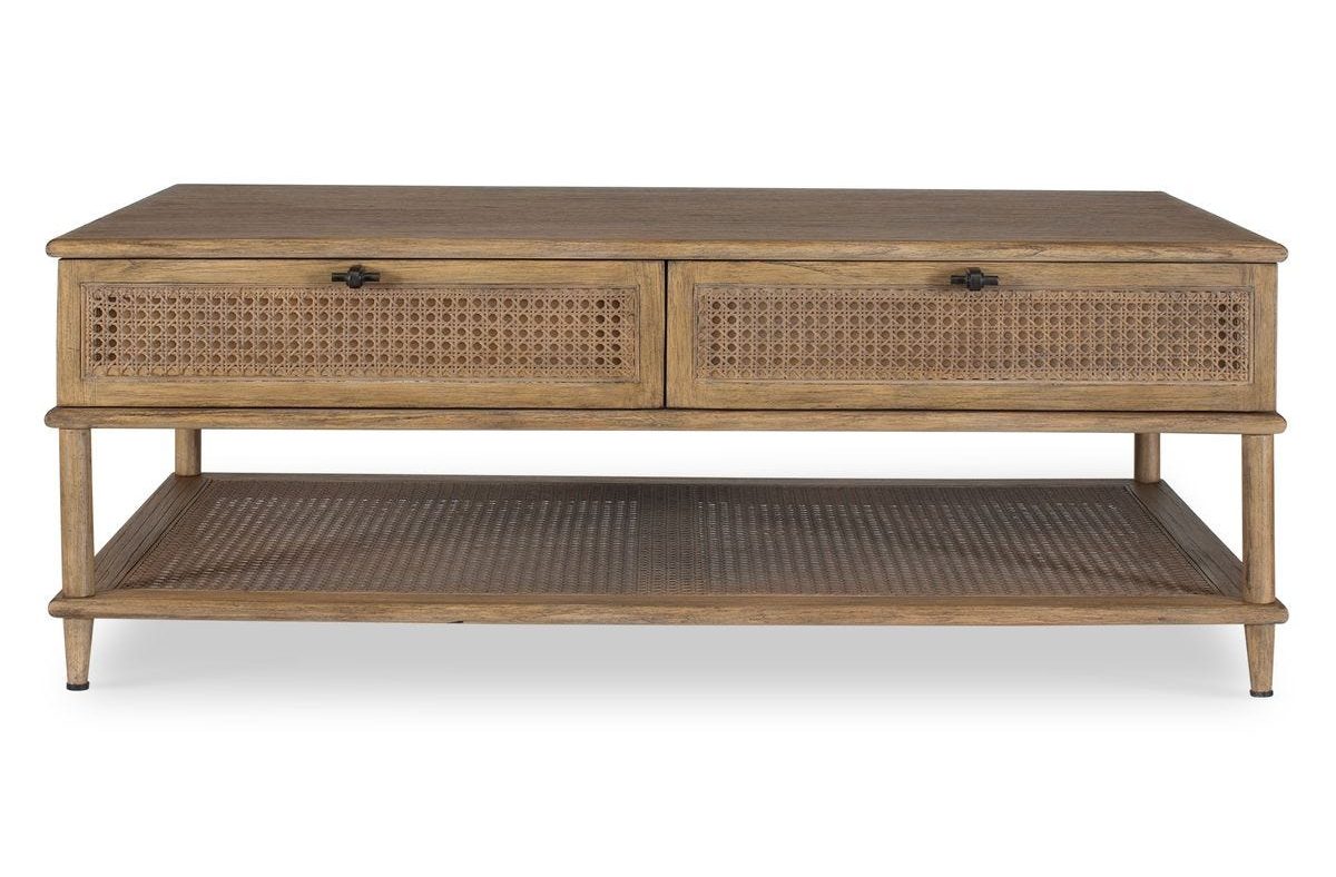 Mid century inspired with accents of natural rattan cane, this side table features mindi solids and veneers finished in a soft oak stain. Has one storage shelf and drawer with metal hardware in dark gunmetal.